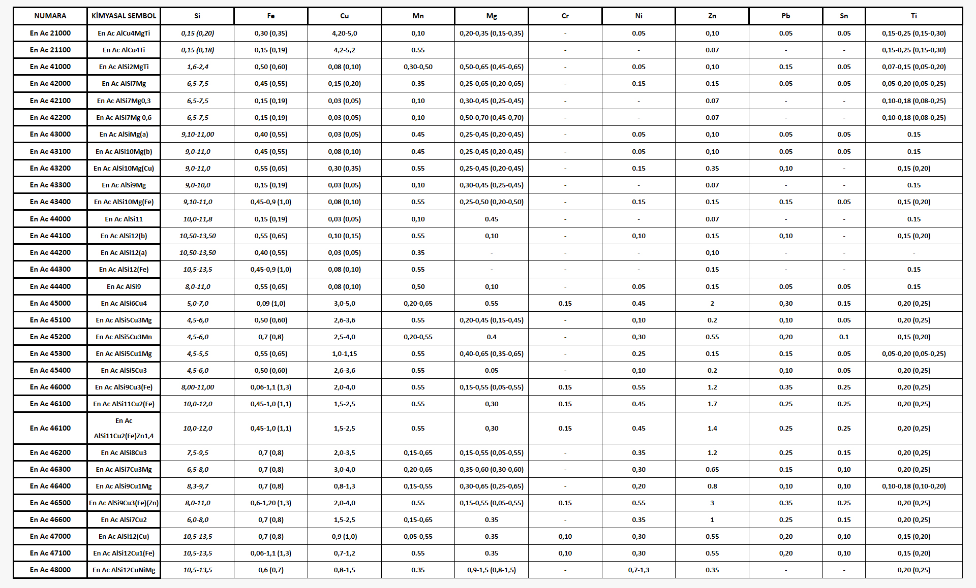 NUMARA | KİMYASAL SEMBOL | Si | Fe | Cu | Mn | Mg | Cr | Ni | Zn | Pb | Sn | Ti |