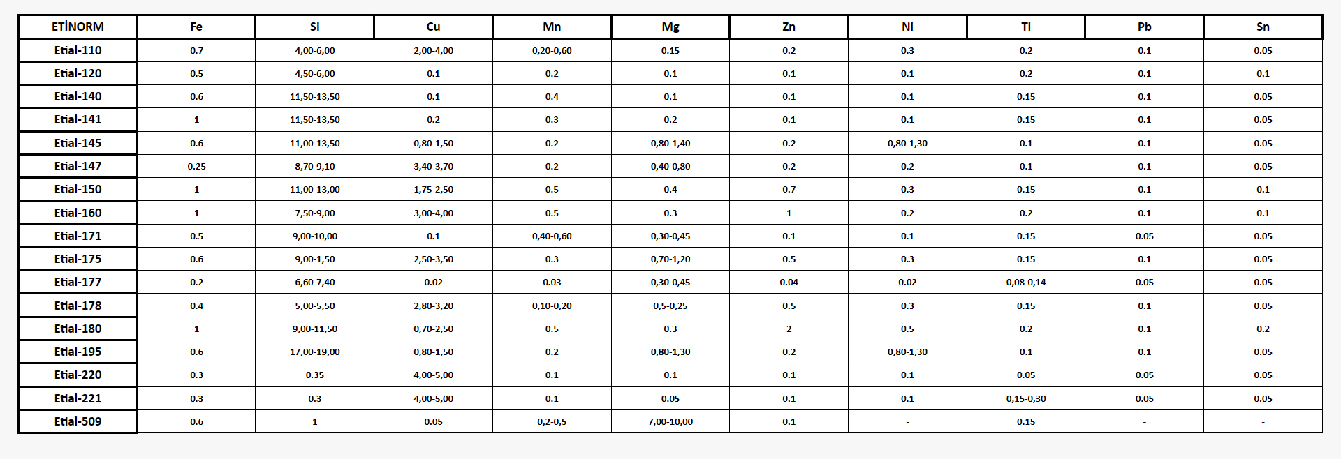 ETİNORM | Fe | Si | Cu | Mn | Mg | Zn | Ni | Ti | Pb | Sn |